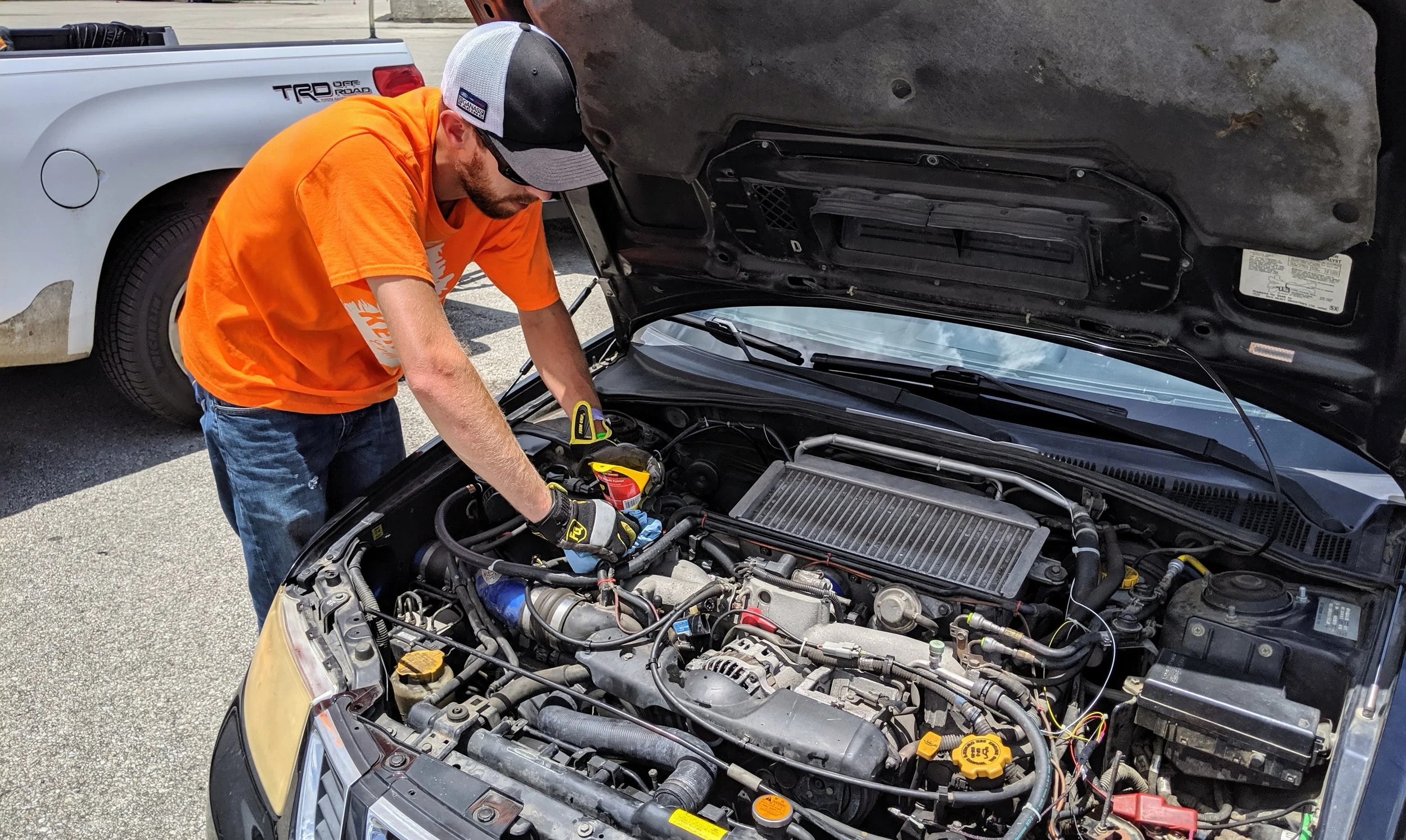 Another friend, Nik (owner of the shop where all the original work was going on, and previous owner of this car), came down just to hang out and showed up right around lunch. It was perfect timing; we got lunch and drove to a couple of auto parts stores, eventually finding a replacement upper hose.